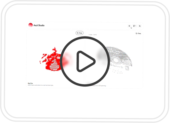 Export with ease Export your ASCII creations instantly in clean, ready-to-use, component, videos and more.